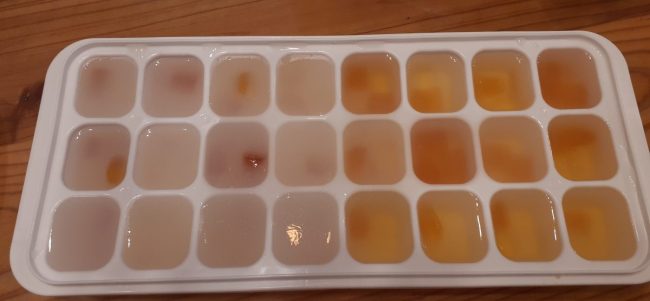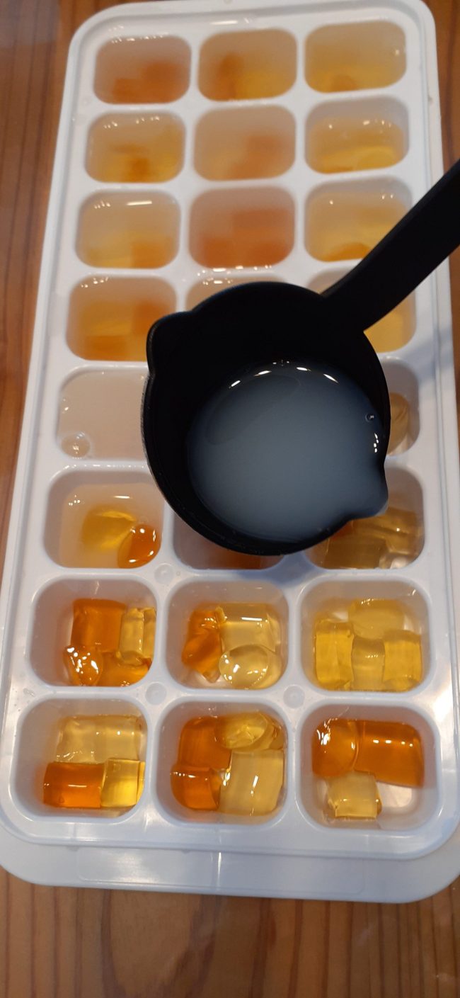 製氷皿へ注ぎ、次は冷蔵庫へ!そして固まったものがこちらです。