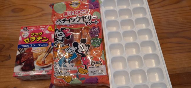 材料はゼラチン、カラフルなゼリー、桃ジュース、サイダージュース、そして製氷皿を準備いたしました。