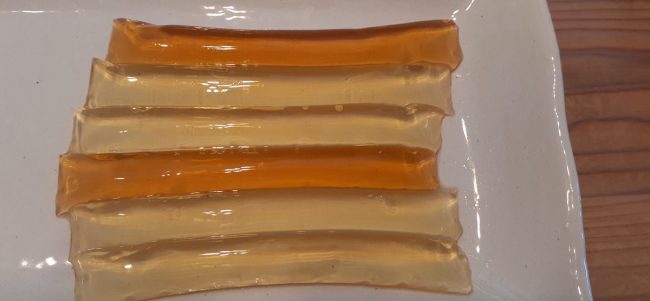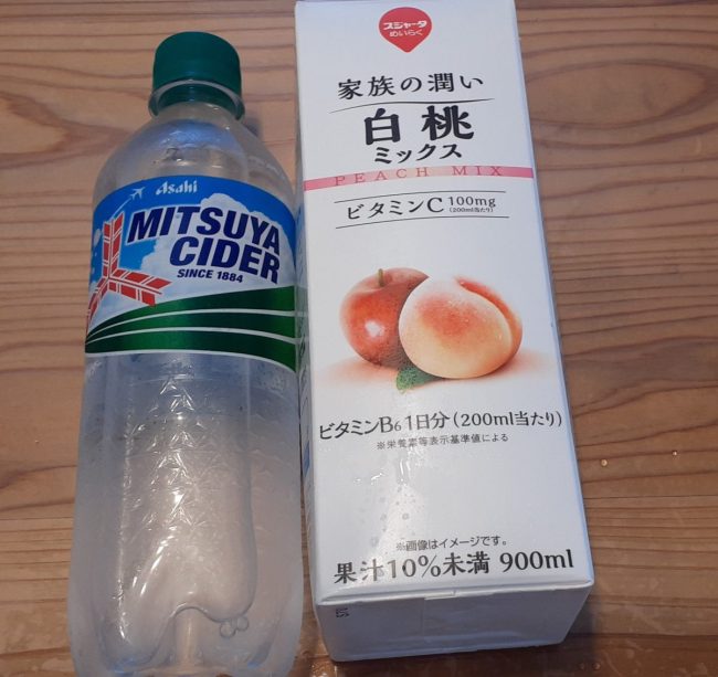 (なお、作り方を参考にしたレシピでは、ゼラチンではなく「アガー」、桃ジュースは「いろはす桃」が正解なのですが、お店になかったので代用しました)