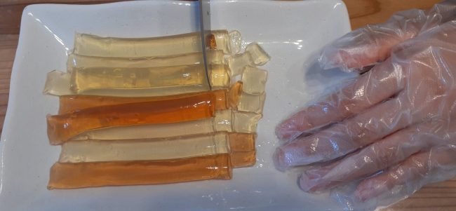 材料を揃え、次はカラフルなゼリーを切っていきます。可愛いミッキーが書かれたゼリーをお皿にだします。