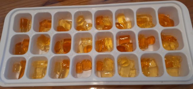 さて、この固まったゼリー。実は作る前にふと「固まったゼリーはきれいに製氷皿から取れるのか?」と疑問に思っていたのですが、案の定取れませんでした。