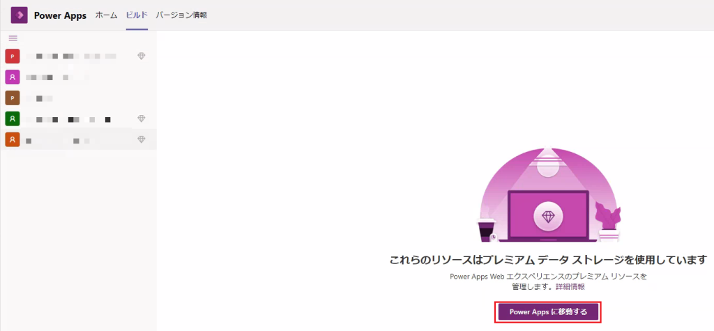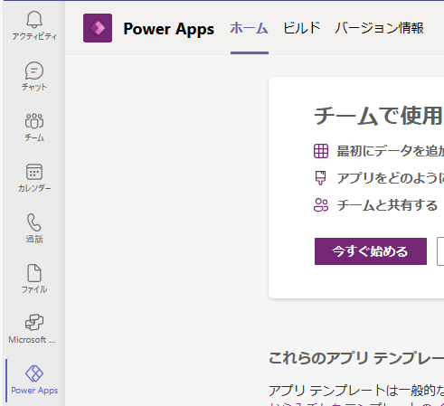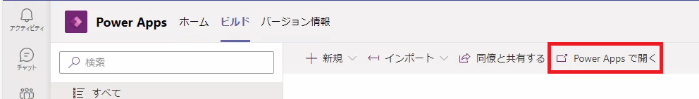 Teams内のPower Appsアプリを開き、[ビルド]から環境を一覧で確認します。