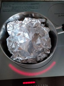 - 写真のように、鍋に入れて煮込む際に落し蓋をすると、具材の煮崩れを防げます。(我が家には、落し蓋がないので、アルミホイルをして煮込みました)