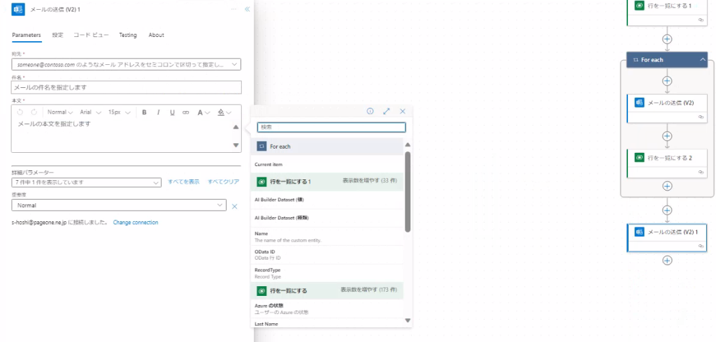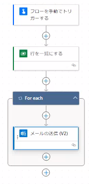 この場合、上記画像のように[メールの送信]のアクションが[For each]内に格納されます。そして条件に一致するデータが複数あった場合は、取得したデータの数メールが送られることになります。