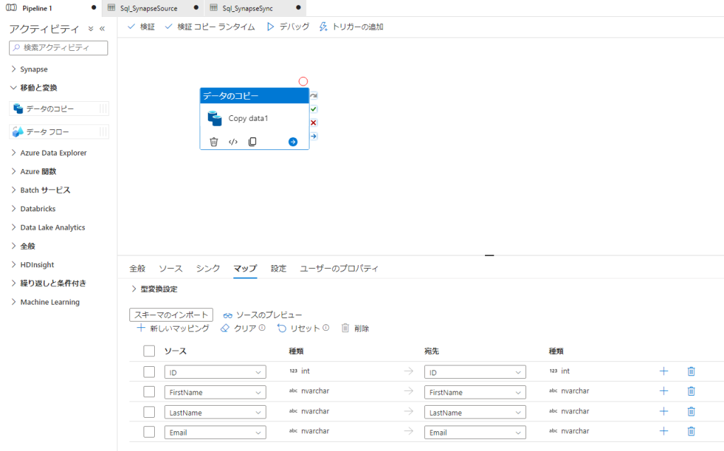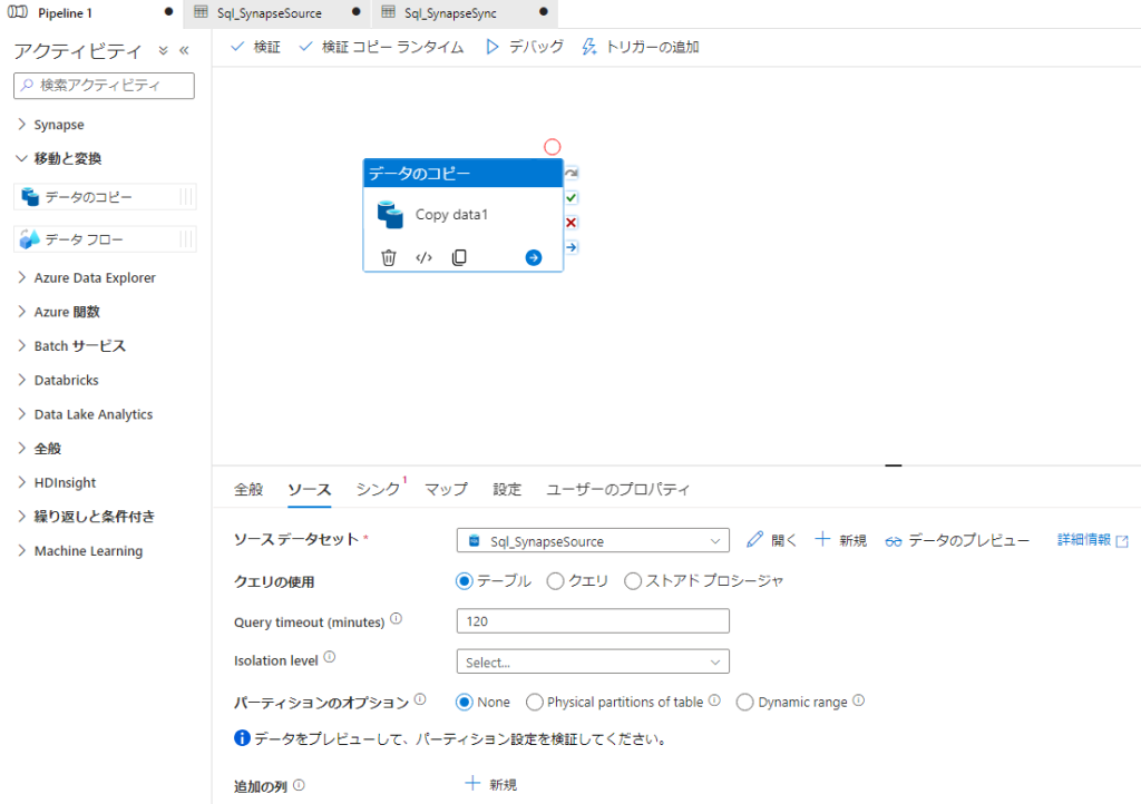 アクティビティの選択: Synapse Studioのワークスペース内で、「データ」セクションを選択し、「データのコピー」アクティビティを選択します。