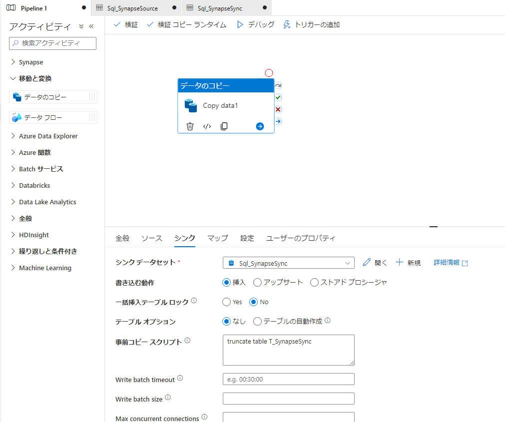 ターゲットの設定:ターゲットとなるデータセットを指定します。事前コピースクリプトにシンク先のテーブルのデータを削除するTRUNCATE文を入力します。