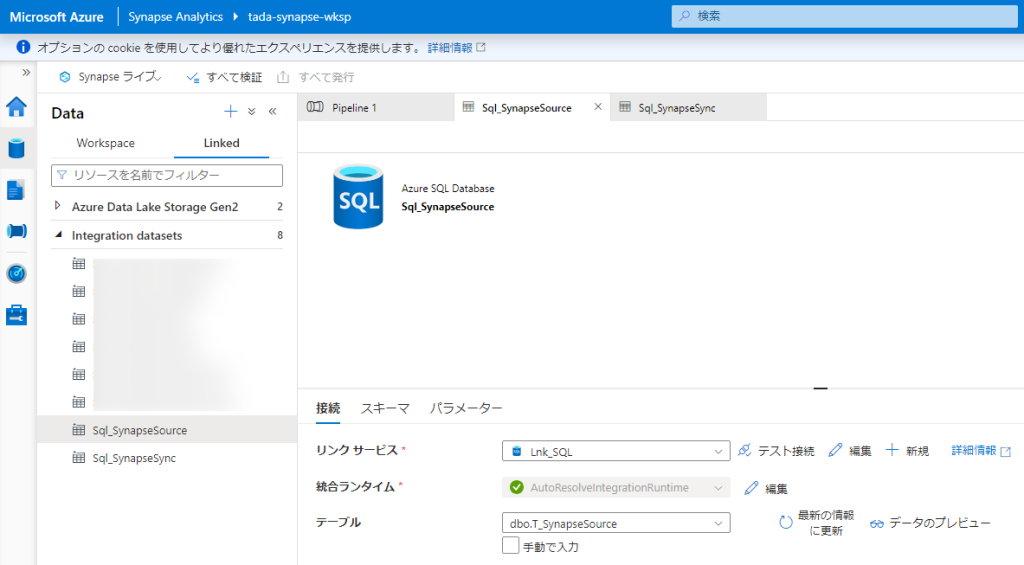 データセットの作成:ソーステーブル、シンクテーブルのデータセットを作成します。ここでSQLやOracleなど様々なリンクサービスへの接続が可能になります。