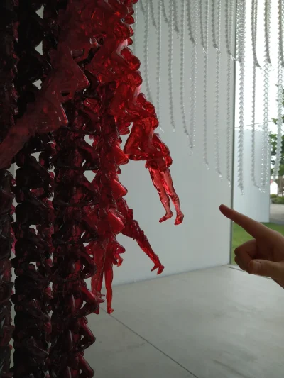3色のグラデーションで配色された、無数の人形が肩車で連なり、シャンデリアのように天井から吊るされた作品。