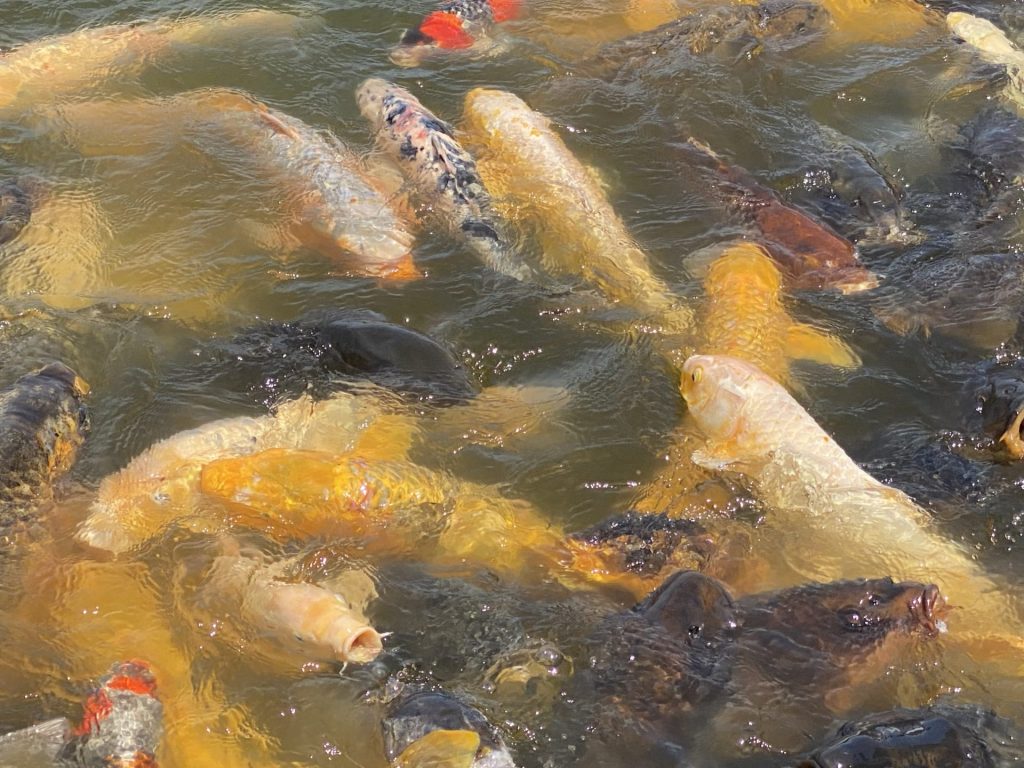 餌をあげ始めるとすごい水しぶきとともにたくさんの鯉が…。
