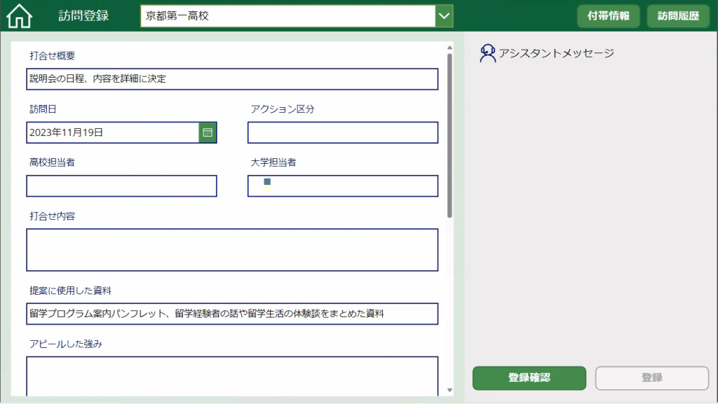 このアプリは高校訪問を行う前の準備、訪問後の記録の登録時に使用します。