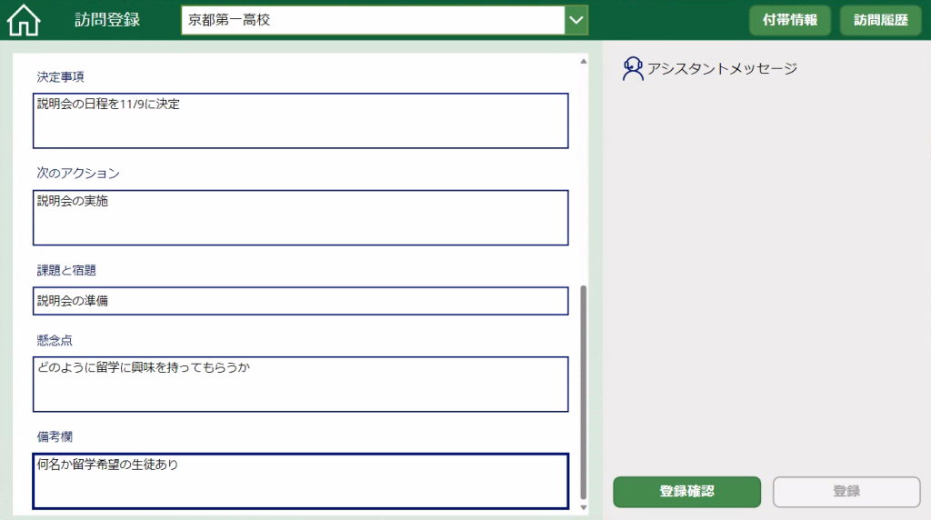 最後に訪問後に使用する、訪問登録の画面です。こちらの画面では訪問の記録を入力し、データベースに登録します。