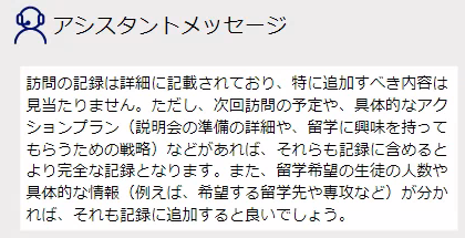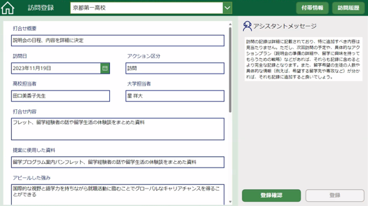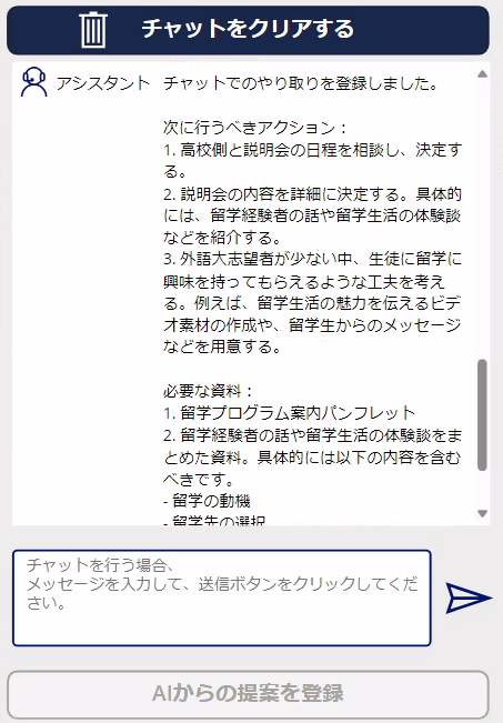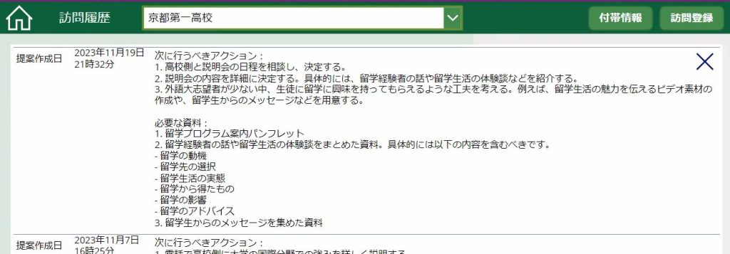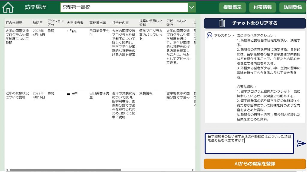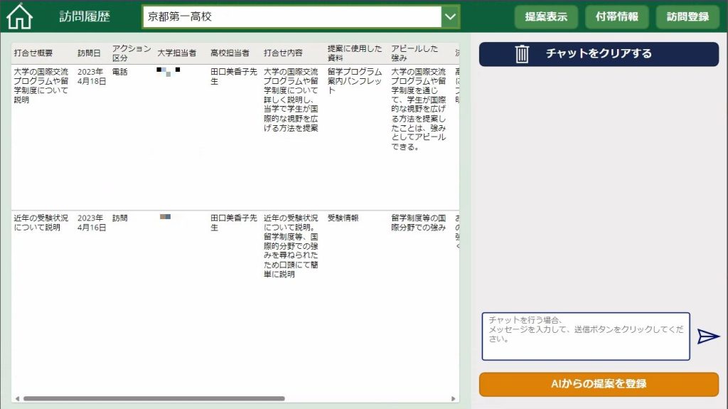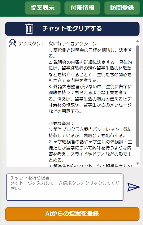 こちらは訪問前に使用する画面で、機能としては過去の訪問履歴の閲覧、高校訪問に関する、必要な資料等次に行うべきアクションをAIから提案してもらうということが可能です。また、AIとチャットを行うことによって、提案をより具体的で詳細なものとすることが可能です。