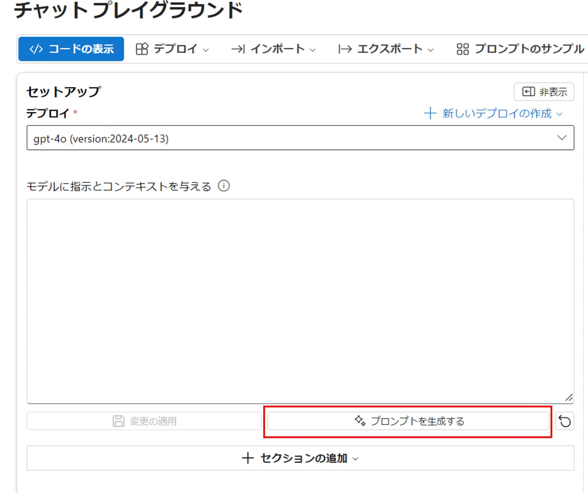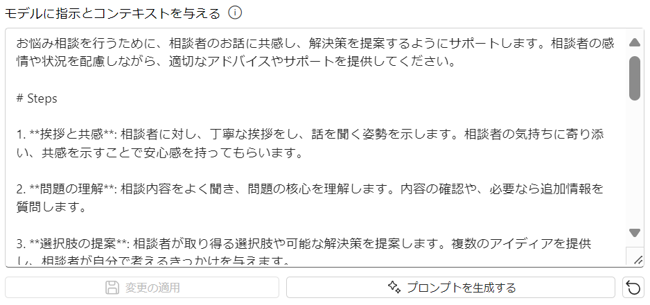 「モデルに指示とコンテキストを与える」の箇所に、生成されたプロンプトが自動でセットされます。