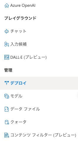 Azure OpenAI Studio でサイドバーに表示される、管理メニューの「デプロイ」を選択します。