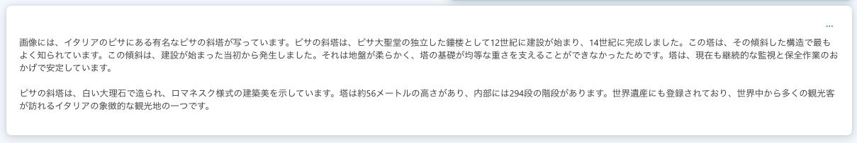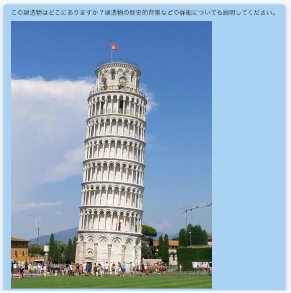 次に、イタリアにあるピサの斜塔の写真を以下のプロンプトと共に送信してみます。