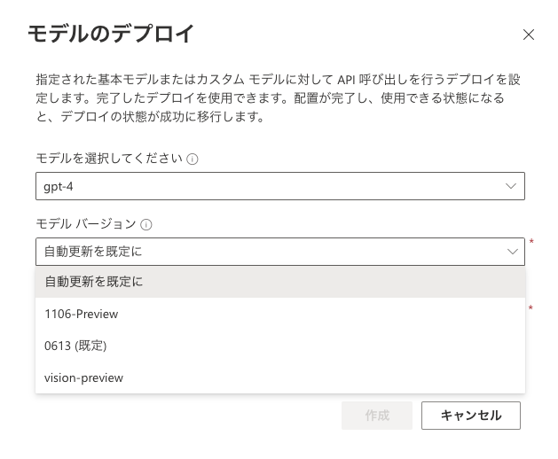プレイグラウンドで検証するために、まずはAzure OpenAI Studio でGPT-4 Turbo with Vision モデルをデプロイします。