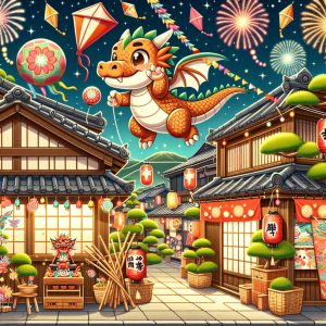 プロンプト:日本のお正月を楽しむ可愛い辰のイラスト