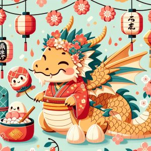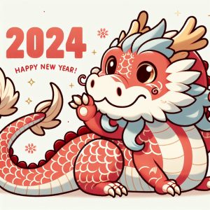 プロンプト:日本のお正月を楽しむ可愛い辰のイラスト。2024という数字も表示してください。