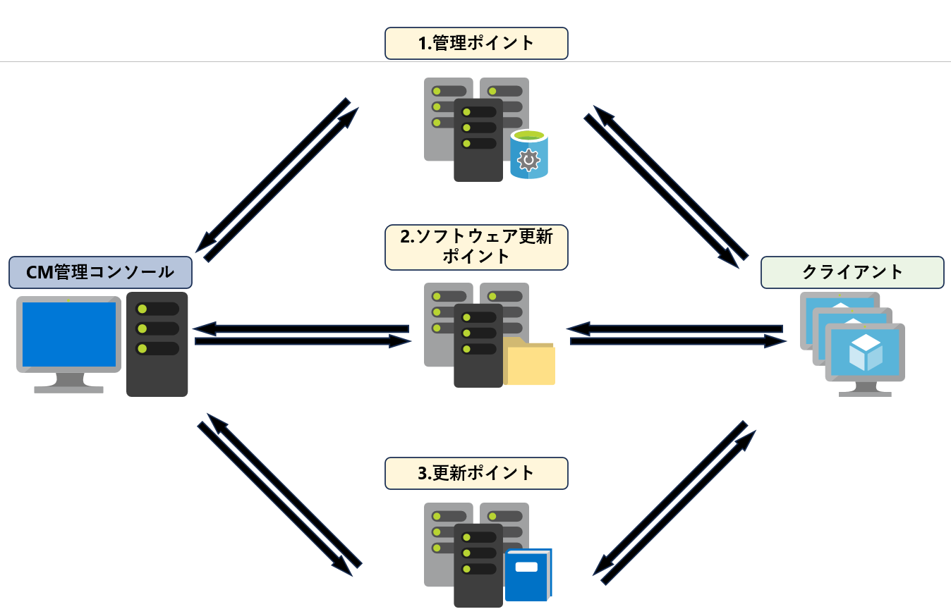 役割としては WSUS からソフトウェアのカタログを同期してサイト サーバーの DB に保持、その後各クライアントのソフトウェアのカタログを収集し更新が必要なものはないか確認します。