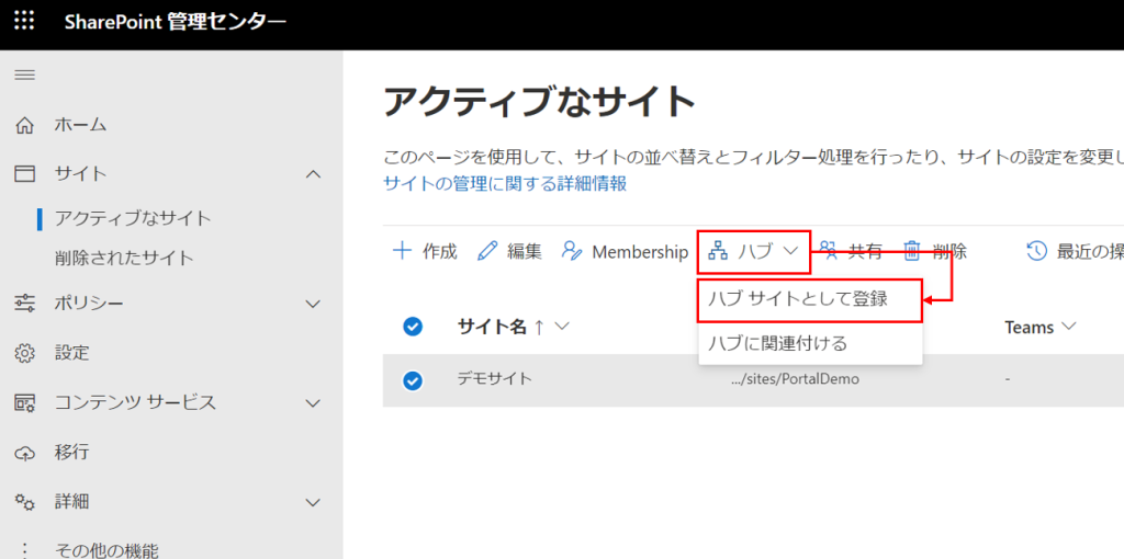 SharePoint管理センターからアクティブなサイト一覧にアクセスし、[ハブ] から [ハブサイトとして登録] をクリックします。