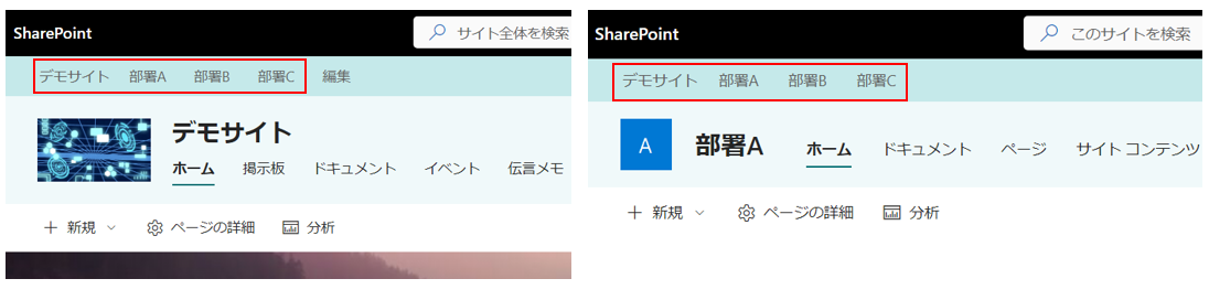 見てわかるように、ハブサイトと関連付けられたサイトでは共通のハブナビゲーションバーが表示されています。もちろん、サイトごとにお知らせ機能、イベント、伝言メモなどを活用することもできますので、使い勝手がいいと思います。