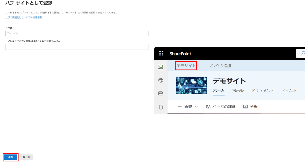 SharePointサイトをハブサイトとして登録し、サイトを関連付ける手順を紹介しました。