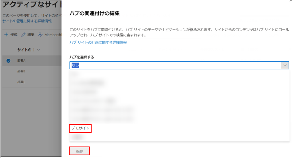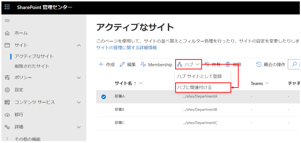 親となるサイトをハブサイトに登録したら、次は部署サイトを関連付けていきましょう。