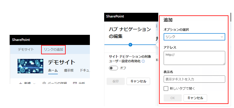 親となるサイトに戻り、関連付けした部署サイトのリンクを入力し、[OK] をクリックします。これでハブナビゲーションに部署サイトAが表示されるようになります。