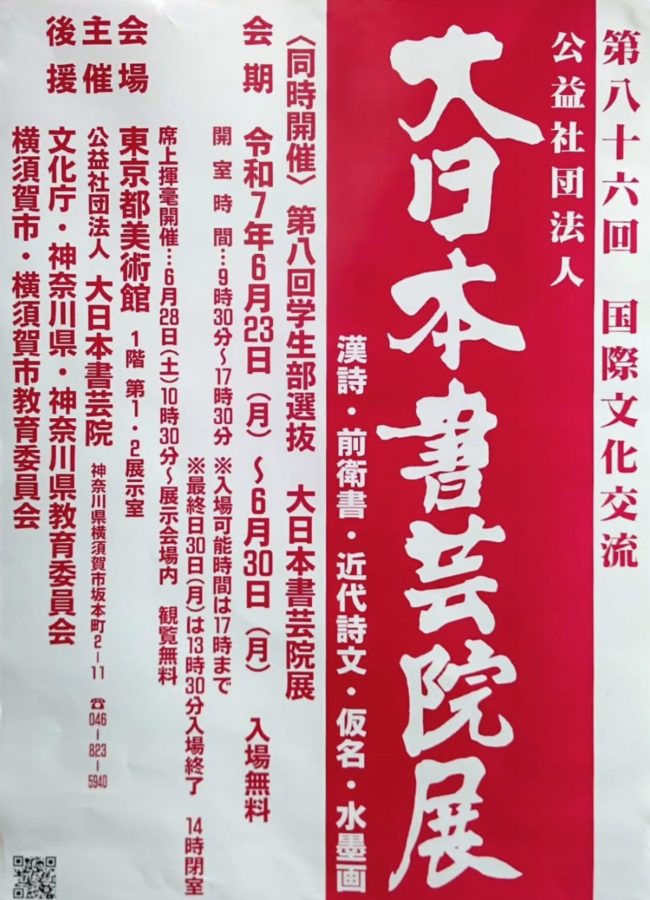 6月23日(月)~30日(月)に東京都美術館 にて開催される「大日本書芸院展 」に、私の書作品が展示されます。
