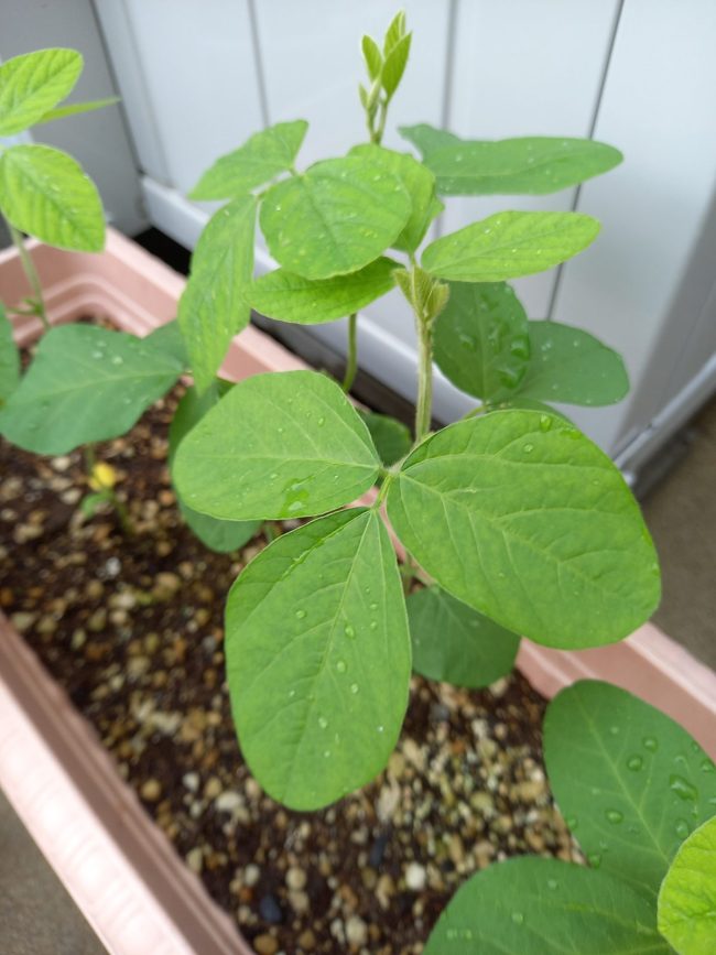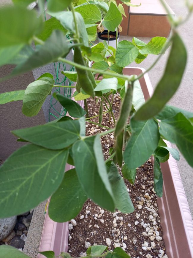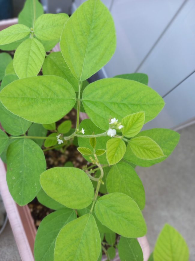 前回の投稿から数日後に花が咲き、枝豆の花は小さめで丸い形をしていて白でした。