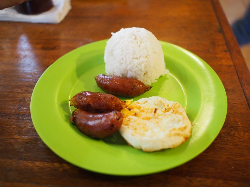 朝食といえば、これもNLExのサービスエリアにある食堂の朝食セットですが、まずはお約束のご飯。で、その左下にあるのは、Longaniza(ロンガニーサ)というソーセージ。これは、スペイン起源のソーセージですね。右下はフライドエッグ。油たっぷりのフライパンで、ほんとうにフライします。目玉焼きって感じじゃぁ、ないです。