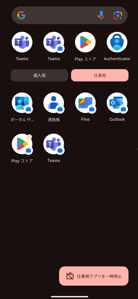 iOS は各アプリ内からアカウントを切り替えることで使用できますが、Android はアプリを仕事用と個人用という領域の2つに分かれ、鞄のマークが付いている仕事用のアプリのみが制限されます。