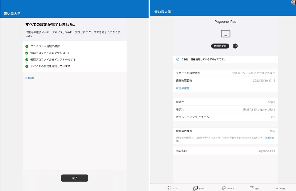 [Microsoft Intune ポータル サイト] アプリに戻り、[完了] をタップ後下記のような画面が表示されていることが確認できれば設定は完了です。