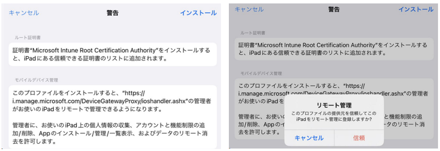 警告画面が表示されますが、[インストール] と [信頼] をタップし、検証済みになっていることを確認します。