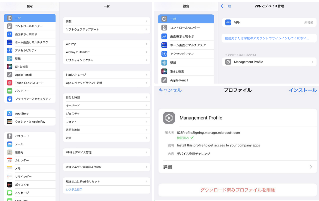 [設定] > [一般] > [VPN とデバイス管理] > [Management Profile] をタップし、[インストール] をタップします。