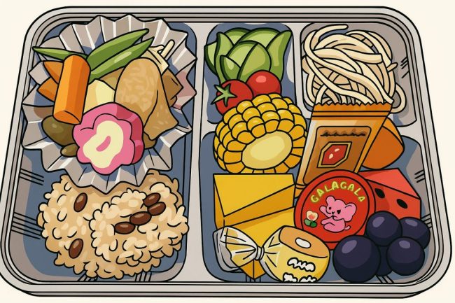 これは「法界折(ほっかいおり/ほうかいおり)」と呼ばれる折詰めを使い、精進料理を基本に、赤飯(または黒豆ご飯)、煮しめ、煮豆、季節の果物、お菓子などが彩りよく詰められています。