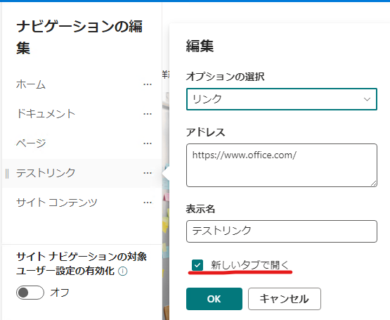 実際のサイトナビゲーションを確認するとリンク、別タブで開く設定がうまく実装されていることが確認できました。