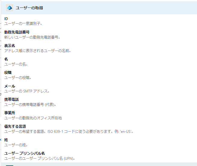 [ユーザーの取得] アクションから出力される値は以下の通りです。