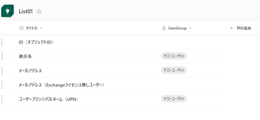 今回はユーザー情報を Entra ID から取得して SharePoint リスト [ユーザー/グループ] 列に値を挿入する流れで検証してみます。