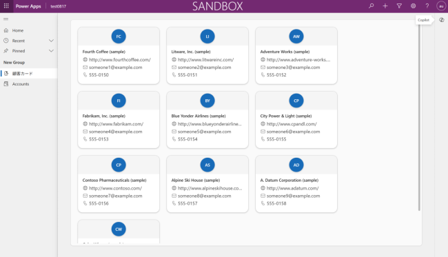 アカウントレコードをモダンな見た目のカードギャラリーとして表示するページを作成してください。