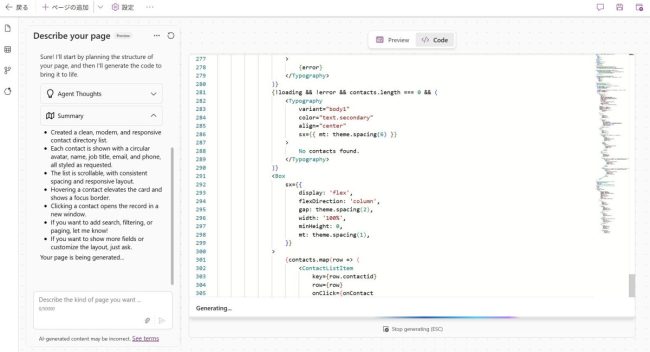 「生成ページ」は、モデル駆動型アプリの編集画面から追加できる機能です。テキストボックスにページの説明を入力すると、AIがその内容に沿ったページを自動生成してくれます。現在は環境が米国地域の場合のみ利用できます。
