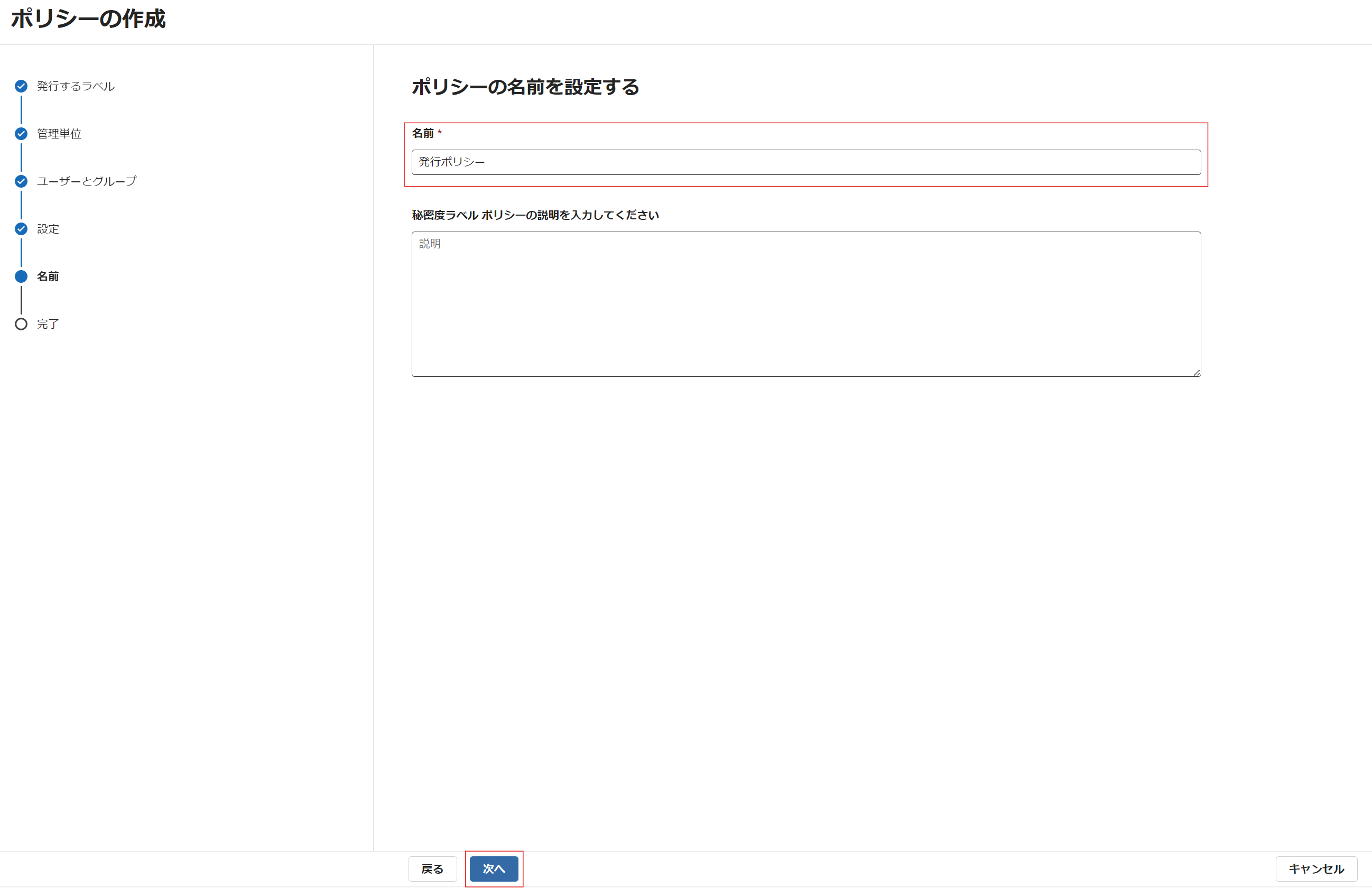 ⑪ 秘密度ラベル ポリシー名を入力し、 [次へ] をクリックします。