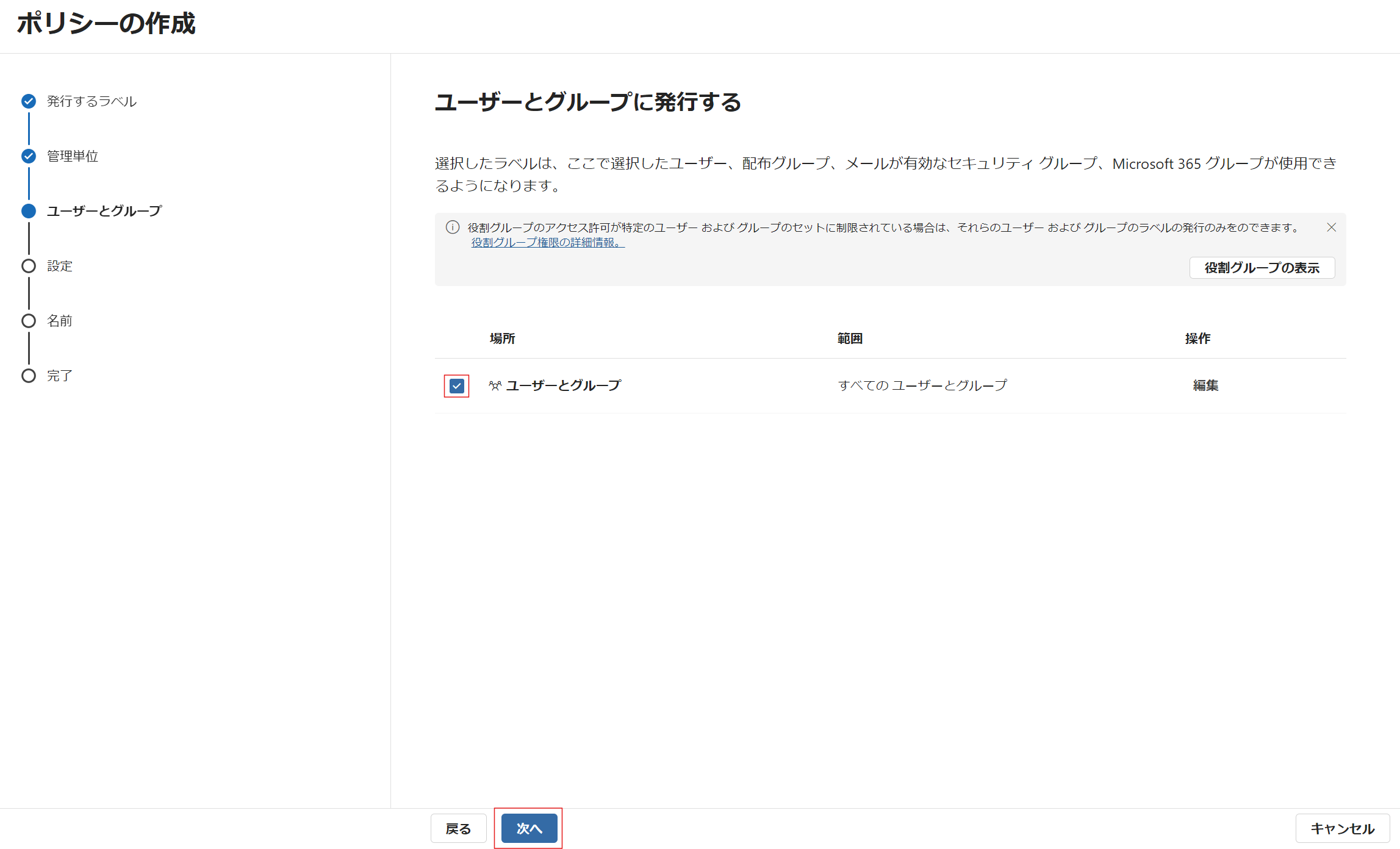 今回はすべてのユーザーとグループに割り当てるため、[ユーザーとグループ] にチェックが入っていることを確認して [次へ] をクリックします。