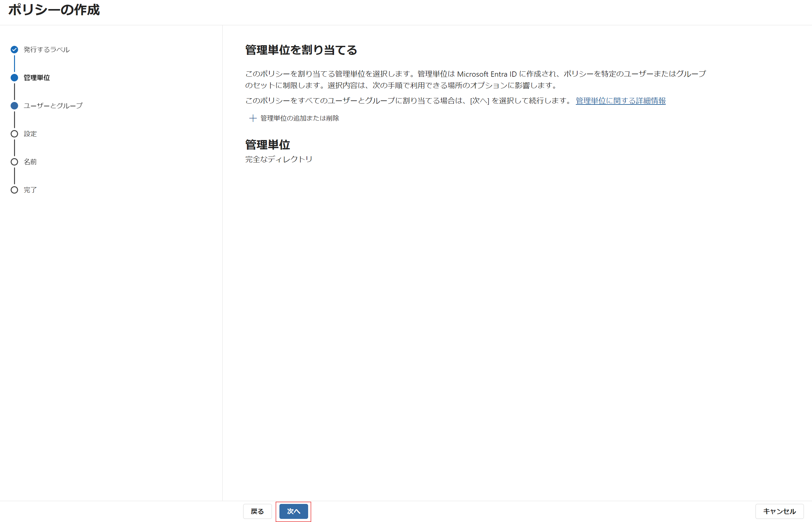④ 管理単位の割り当てはスキップするため、[次へ] をクリックします。