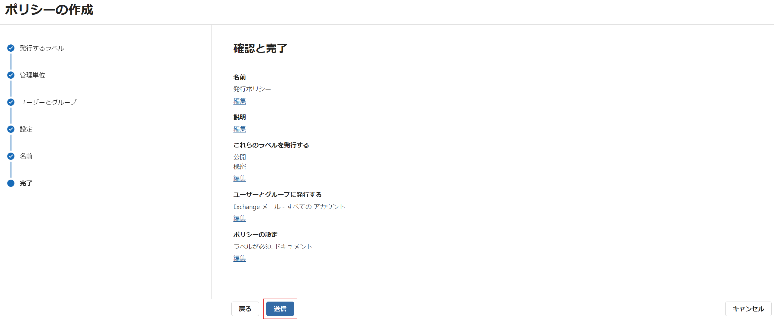 ⑫ 設定内容を確認し、[送信] をクリックして完了です。