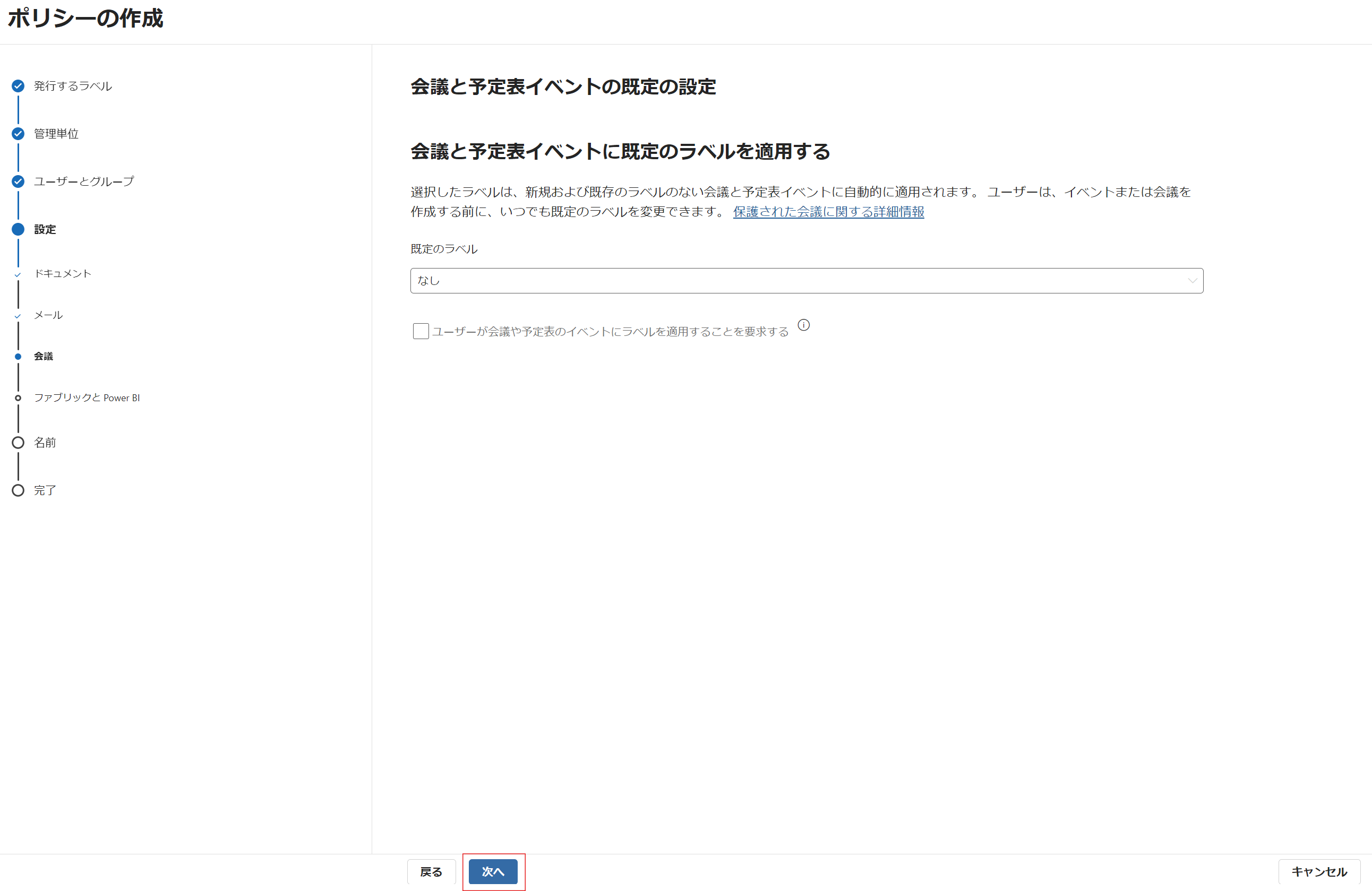 今回は、ラベルの適用を必須とするため、[メールとドキュメントへのラベルの適用をユーザーに要求する] にチェックを入れ、[次へ] をクリックします。