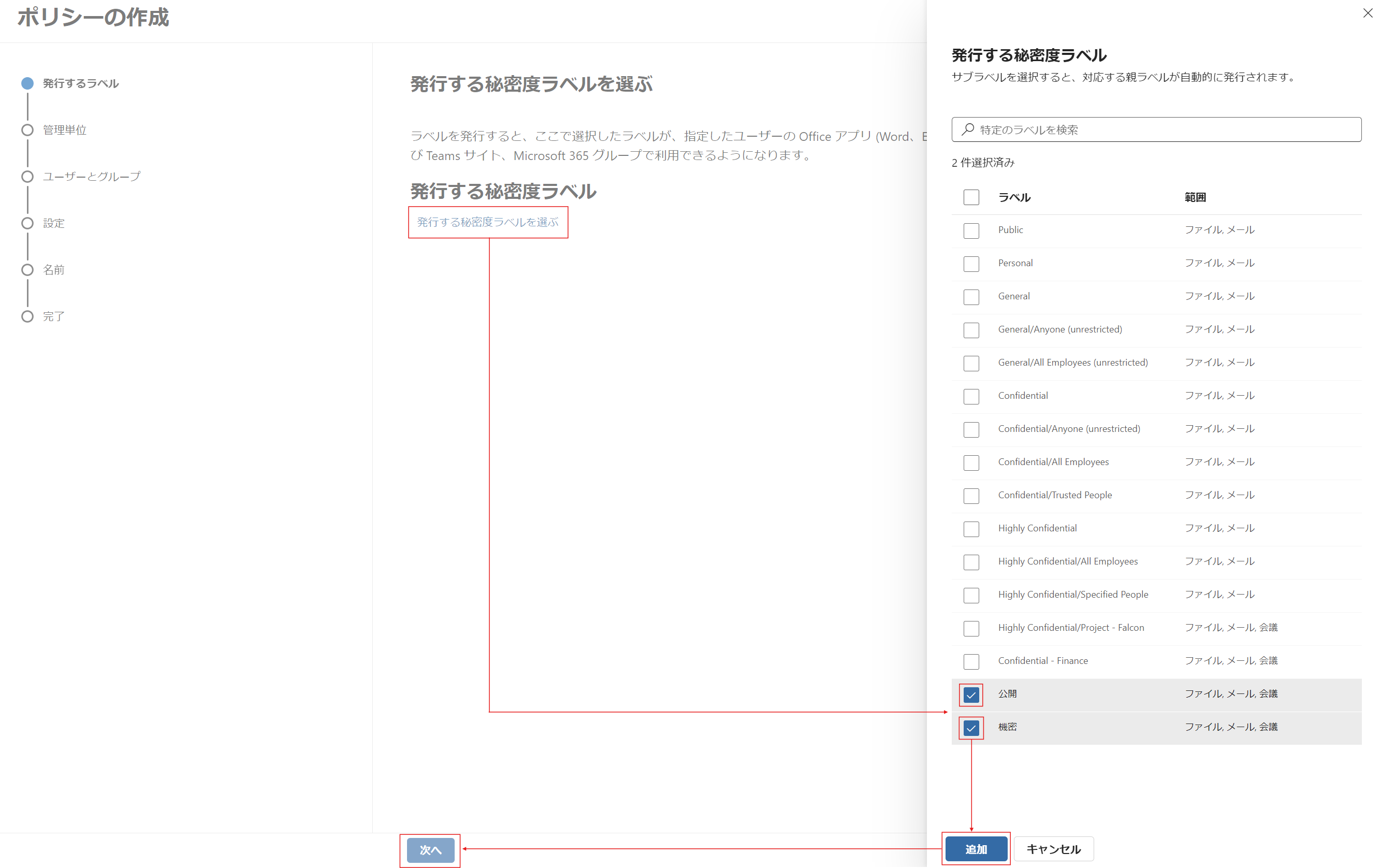 ③ [発行する秘密度ラベルを選ぶ] をクリックし、一覧の中から選択して [追加] をクリックします。
