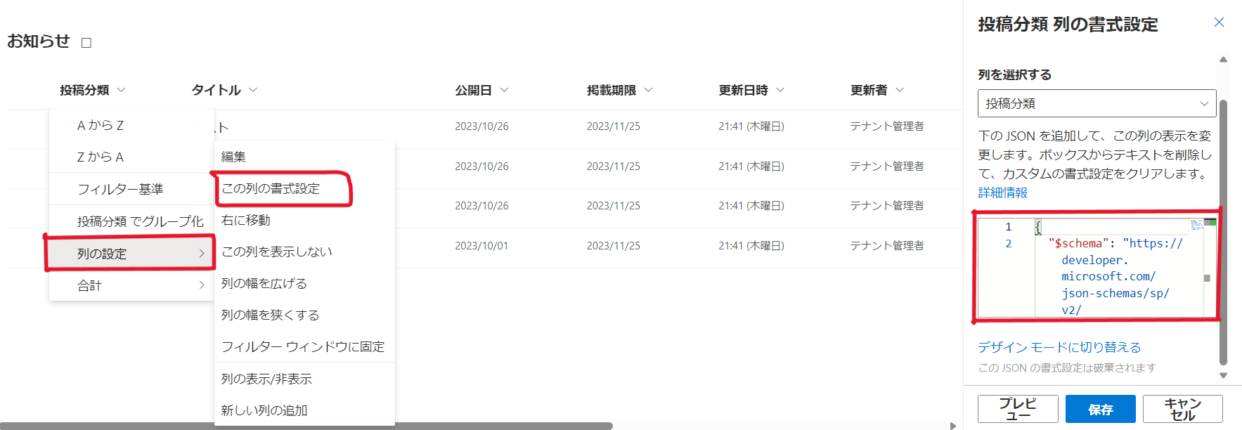 [列の設定] から [この列の書式設定] を選択し、画面右側に出てくる赤枠の部分にJSONを追加します。