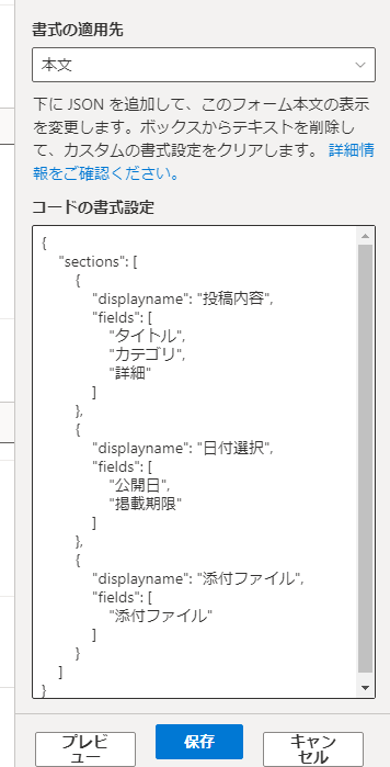 このJSONコードはいくつかのセクションを設けてその中に入力項目を割り当てています。