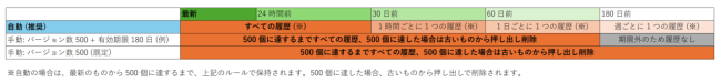 それぞれどのようにバージョン履歴を保持するのかについては、この図をご参照ください。なお、手動での指定はバージョン数は 100 以上の数値、有効期限は 30 日以上の数値でなければなりませんが、カスタマイズすることが可能です。